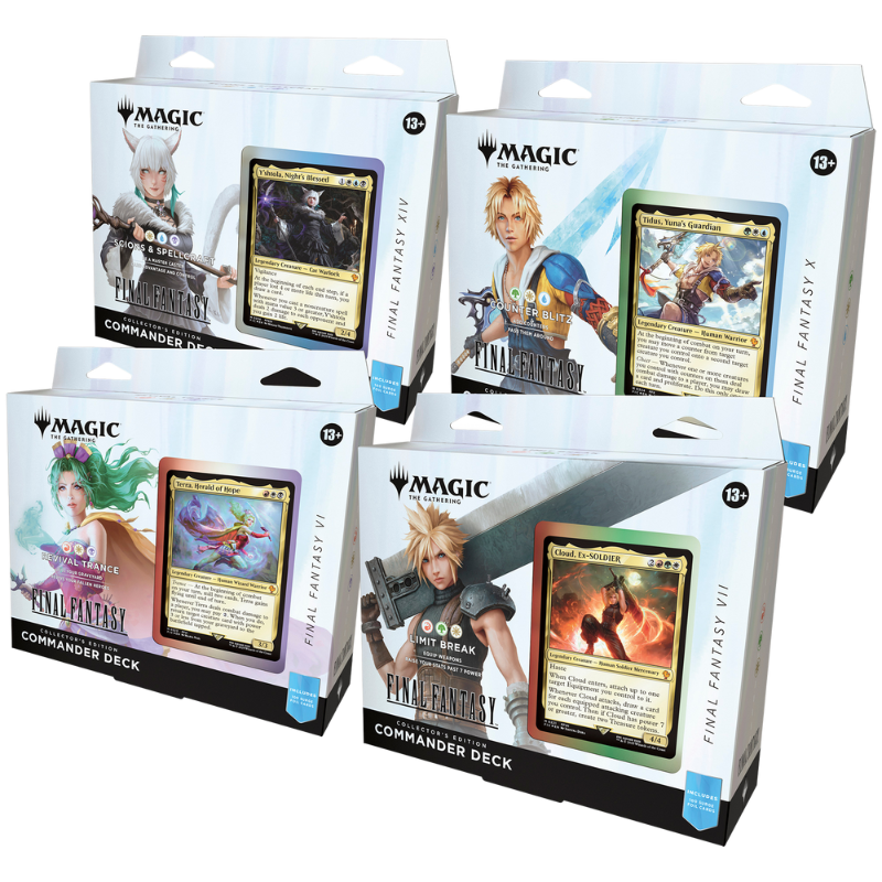 Il Box Commander Deck - Final Fantasy per Magic: The Gathering è una confezione che include 4 mazzi Commander tematici ispirati alla celebre saga videoludica di Final Fantasy. Ogni mazzo da 100 carte offre comandanti leggendari, carte foil esclusive e strategie uniche, ideali per il formato Commander.