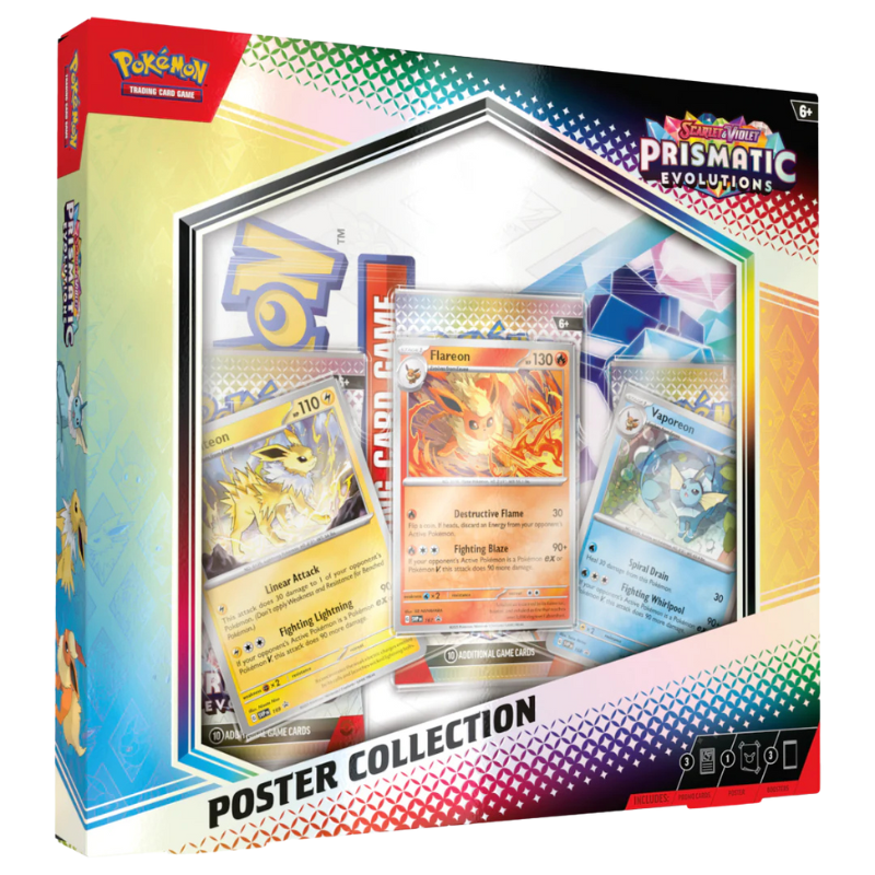 Gli amici di Eevee formano un arcobaleno tutto da scoprire! Le tre evoluzioni di Eevee scoperte originariamente nella regione di Kanto occupano un posto speciale nel cuore degli Allenatori di Pokémon di tutto il mondo, e ora puoi aggiungerle alla tua raccolta come carte promozionali olografiche! Ti attendono anche un poster con illustrazioni tratte dall’espansione speciale Scarlatto e Violetto - Evoluzioni Prismatiche e tre buste di espansione da aprire: chissà quali carte troverai al loro interno!