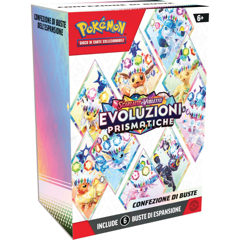 Amplia e fai evolvere la tua raccolta con questa confezione da sei buste dell’espansione Scarlatto e Violetto - Evoluzioni Prismatiche del GCC Pokémon!