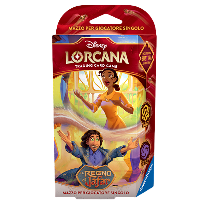 Entra nel magico mondo di Disney Lorcana con lo Starter Deck "Il Regno di Jafar" Ambra/Ametista! Perfetto per i nuovi giocatori e per chi desidera un mazzo già testato e pronto all'uso, questo starter deck ti offre tutto ciò di cui hai bisogno per iniziare a giocare subito.